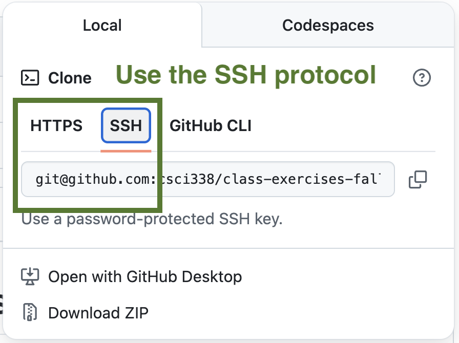 csci338directory, clone theclass-exercises-fall2025repo using the ssh method using the following command:git clone ADDRESS_YOU_JUST_COPIEDThe address should look something like this: