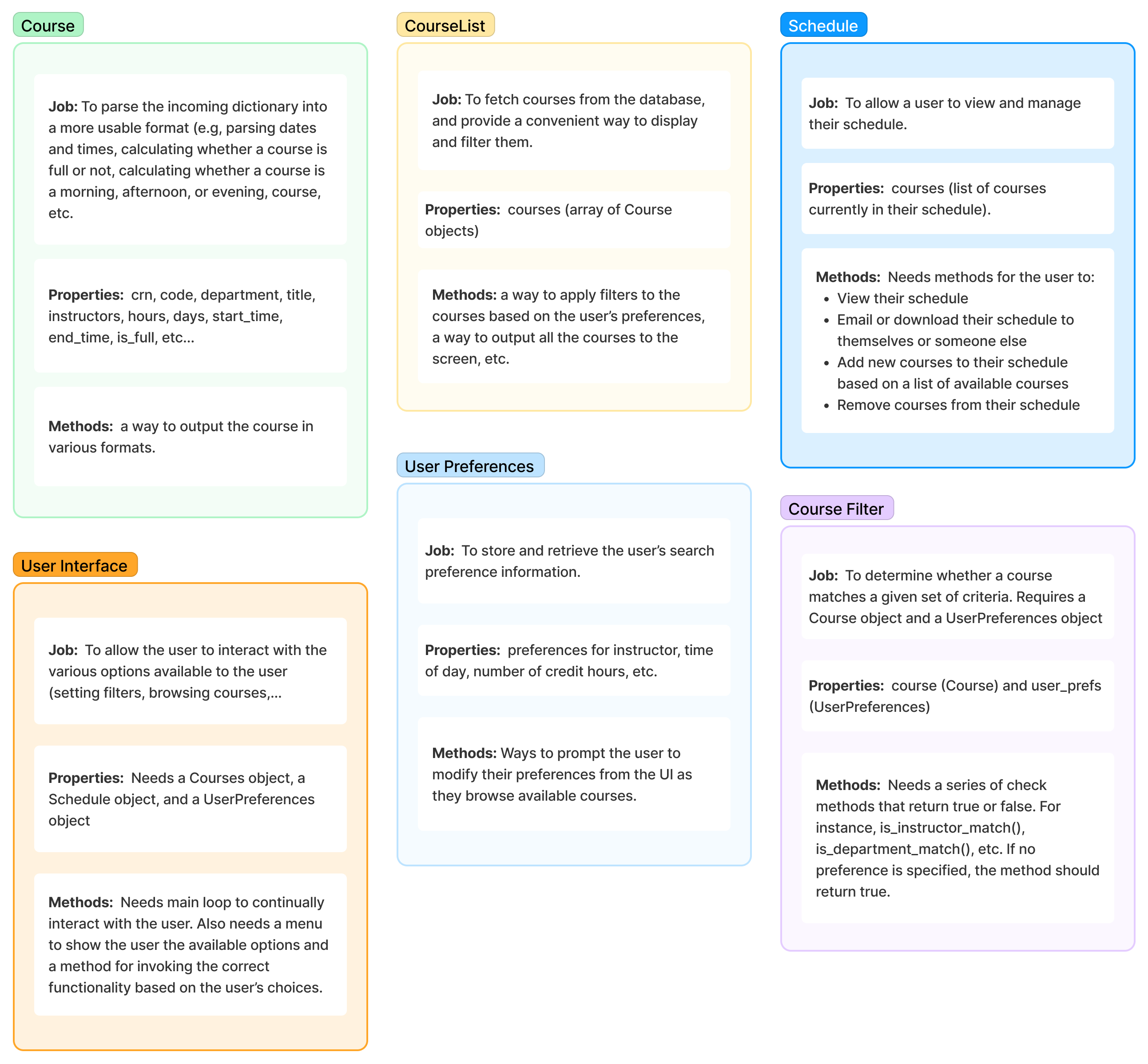 The job of the Course class (course.py) is to parse the incoming dictionary into a more useable form. If you have been assigned this issue, please note that the rest of the app is highly dependent on this class, so the earlier you complete this task, the easier it will be for your teammates.